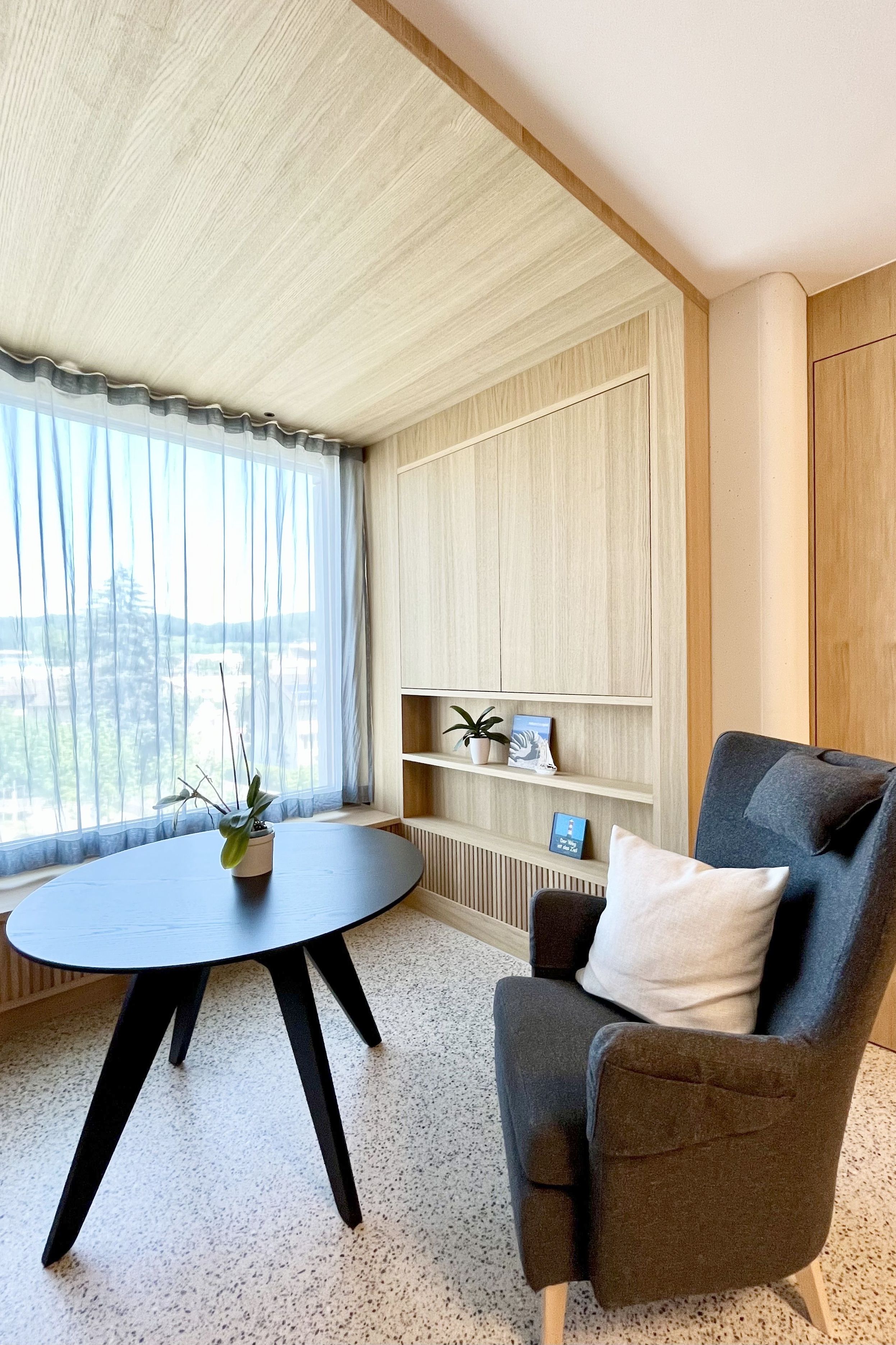 Die Wohnbereiche sind nach den Edelsteinen Saphir, Bernstein, Rubin und Rosenquarz benannt und farblich gestaltet.