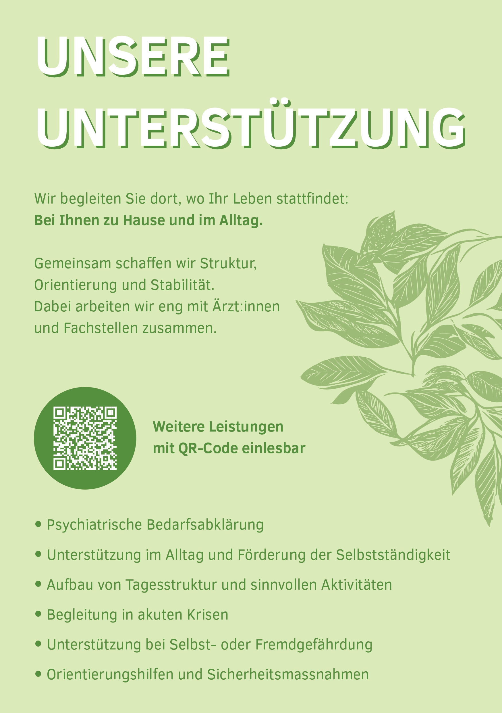 Die Fachperson vom Team Psychosoziale Pflege baut eine tragende Beziehung zur betroffenen Person auf. Auf Wunsch und nach Möglichkeit werden die Angehörigen, das soziale Umfeld und das Helfernetz mit einbezogen. Die Bedürfnisse der betroffenen Person stehen im Vordergrund, der Kontakt auf Augenhöhe und der gegenseitige Respekt sind Basis der Zusammenarbeit.